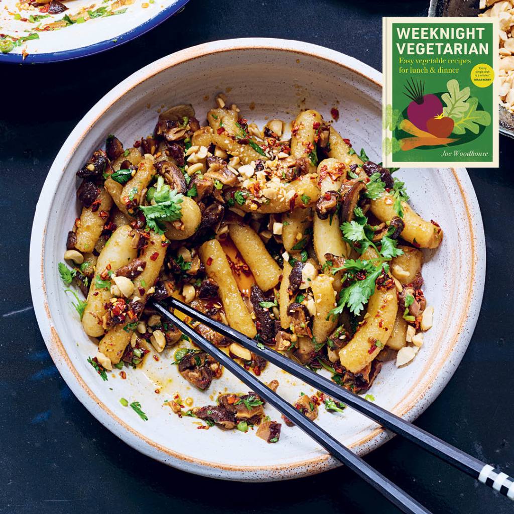 “These make a pretty quick and comforting dinner. My kids really like them and they are super versatile. It doesn’t really matter what shape they end up – fat, thin, short or long dumplings – they taste just as good and make a fun plate. This one-pot recipe is designed for using up ready-cooked potatoes. However, if you don’t have any in the fridge, you can boil the same quantity, peeled and quartered, for 12–15 minutes until tender, then chill them under a cold tap. If I am in a rush I like to roll out the dough with a rolling pin then make criss-cross cuts to form little diamonds. Otherwise use good-quality pre-made noodles like udon. The sauce can be as spicy or not, as you please, and a plateful of steamed green veg goes very well alongside.” Joe Woodhouse, author of Weeknight Vegetarian